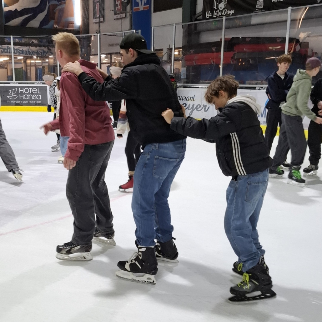 Nach den ersten vorsichtigen Runden, oft noch an der Hand oder gemeinsam mit dem „Zwerg“, wuchs bei allen schnell das Selbstvertrauen. 💪 Schon bald wagten sich die meisten alleine aufs Eis und drehten ihre Runden. Dabei wurde viel gelacht, sich gegenseitig geholfen und kräftig angefeuert. Es war wirklich schön zu sehen, wie schnell alle Fortschritte machten und wie viel Spaß das Eislaufen bereitete. ⛸✨